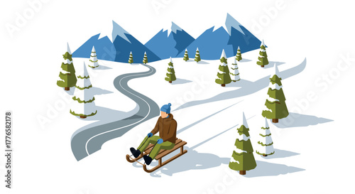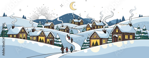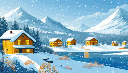 Ski resort with ski track, cable cars, ski lifts, vector illustration. Winter holidays and sport activity. Winter season mountain landscape with alps chalet
