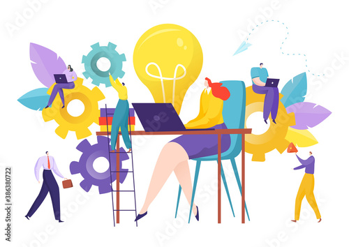 Vector illustration of tiny people putting books and light bulb into big man head. Skill development, brainstorming, innovation, creative thinking, personal growth concept for web banner, website page
