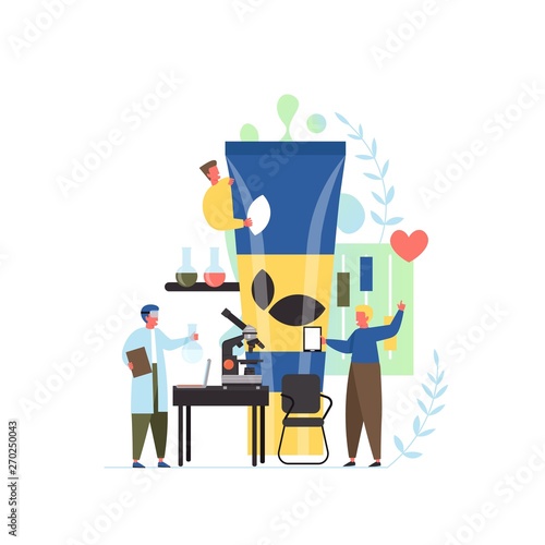 Skincare and cosmetics laboratory, vector flat illustration. New cosmetic product big cream tube and tiny people team of lab experts, equipment. Cosmetic industry concept for web banner, website page.