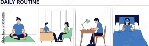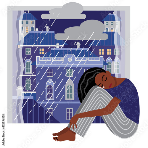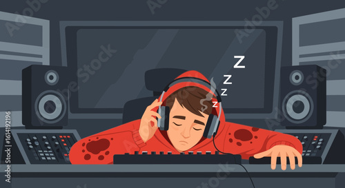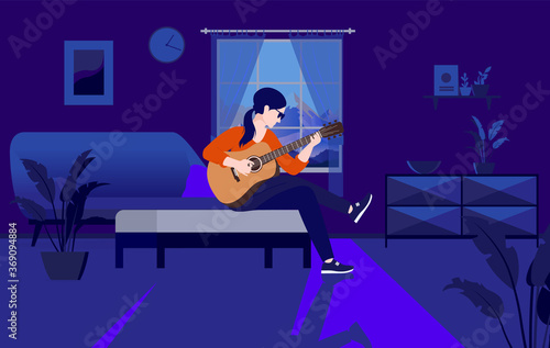 Married couple lying in bed turned away from each other, flat vector illustration. Sleepless woman using smartphone suffering from insomnia. Stress, depression, smartphone addiction, sleep disorder.