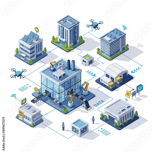 Smart farm icon set, flat vector isometric illustration. Farmer, drone, greenhouse, solar energy panels, agricultural robotics and automated equipment for sustainable crop production. Farm automation.