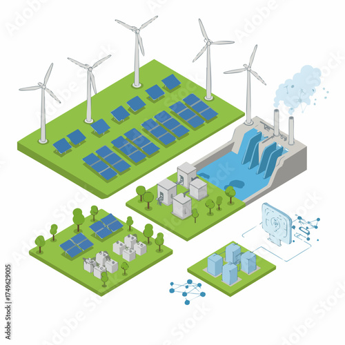 Smart grid network landing page website template. Vector isometric illustration. Wind and solar power renewable energy, smart grid technology concept.