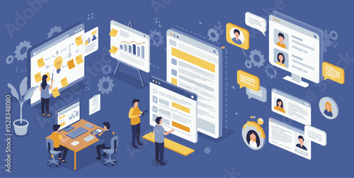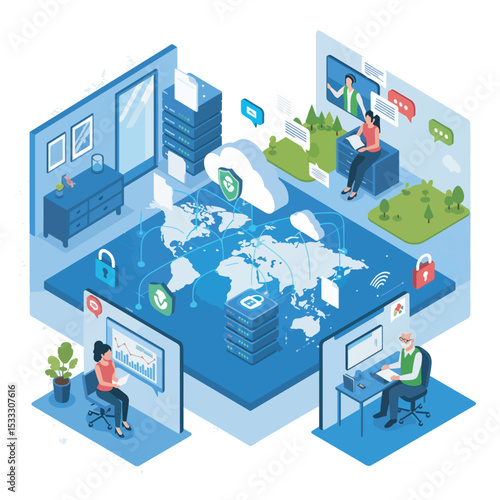 Smart house concept vector flat 3d isometric illustration. Cutaway home interior with smart phone controlled household and bathroom appliances.