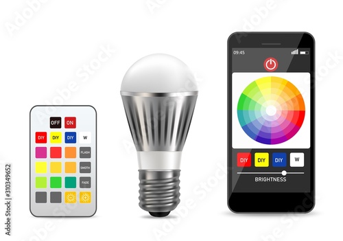 Light bulb controlled via smartphone, vector illustration isolated on white background. Realistic mobile phone and smart led lightbulb.
