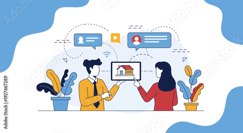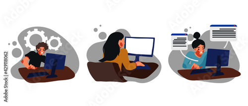 People using smart modern gadgets, vector illustration. Micro male and female characters riding self balancing mono wheel with laptop in hands, using mobile phone with running activity tracking app.
