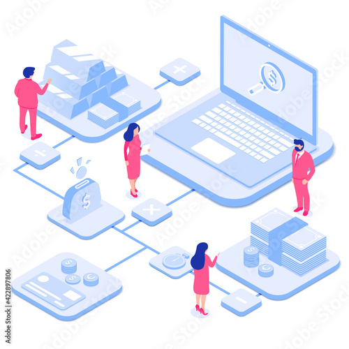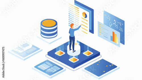 Smart organic farming infographic. Farmer managing his industrial farm using smartphone app, flat vector isometric illustration. Clean energy. Iot, ai, drones, robotics technologies in agriculture.