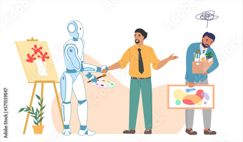 Business people greeting smart robot machine in office. AI and humans working together, flat vector illustration. Artificial intelligence and human collaboration, cooperation.