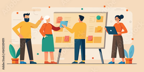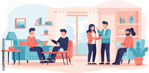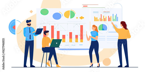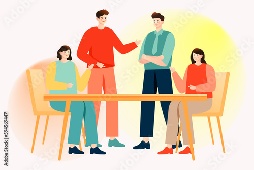 Business people greeting smart robot machine in office. AI and humans working together, flat vector illustration. Artificial intelligence and human collaboration, cooperation.