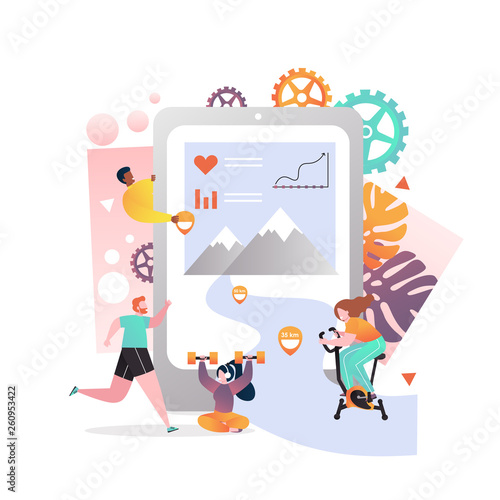 Vector illustration of big smartphone with fitness activity tracking application for exercising, running and tiny people doing sports. Smart sports technology concept for web banner, website page etc.