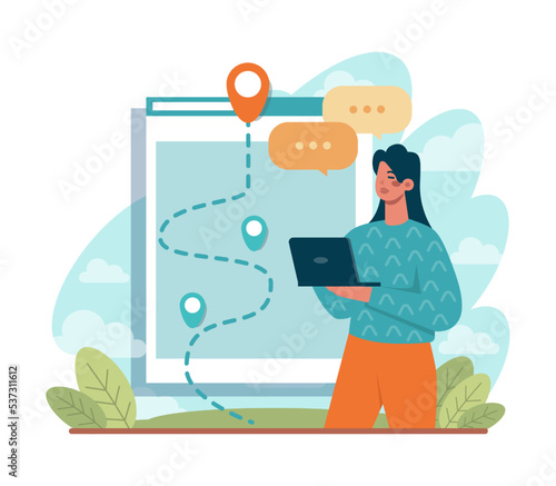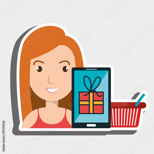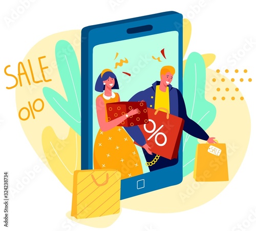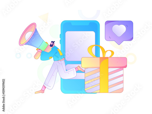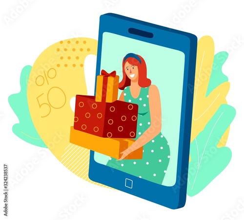 Smartphone bonus, voucher reward, referral gift advertising. Happy woman customer showing mobile phone screen with shopping program and prize for purchase vector illustration