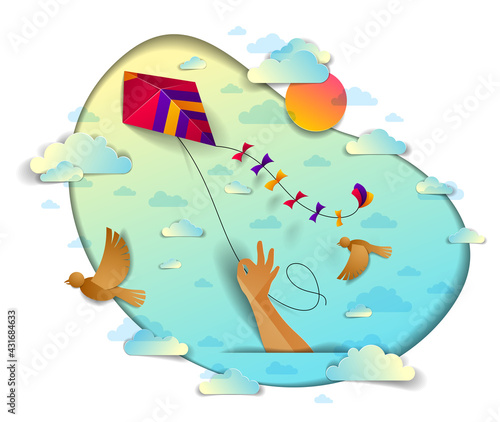 Vector layered paper cut style underwater world and happy tourist couple swimming using snorkel and mask. Snorkeling, summer beach activity composition for web banner, website page etc.