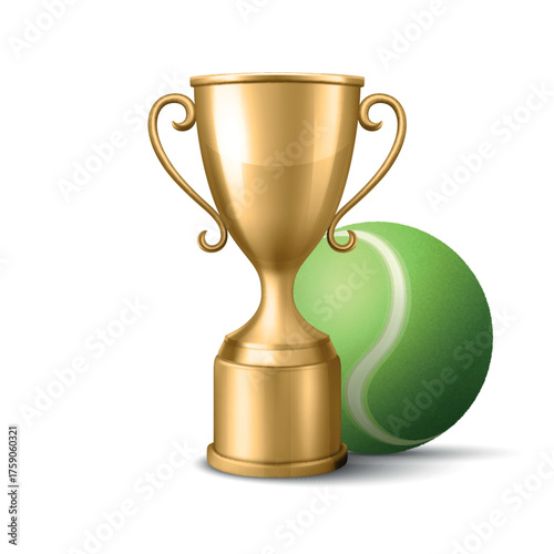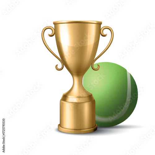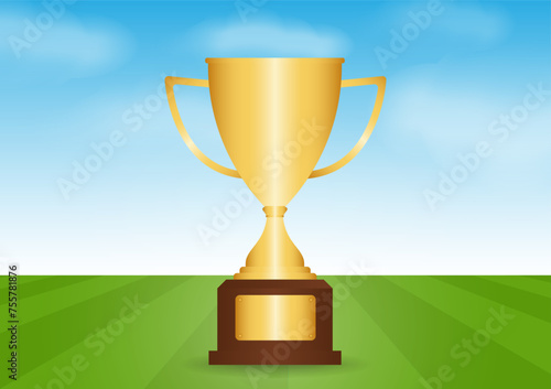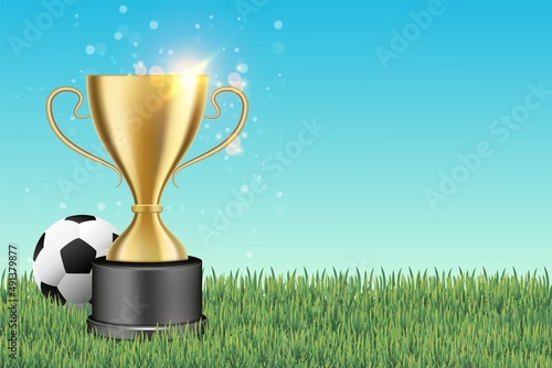 Soccer ball, football cup and green field, 3d vector illustration. Football championship, soccer tournament background.