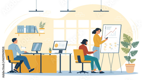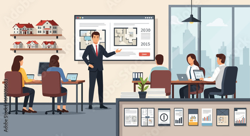 Social distancing in hospital reception room concept illustration. Vector web site design template. Doctor in clinic protected by glass from coronavirus spreading. Patients use face mask in hospital.