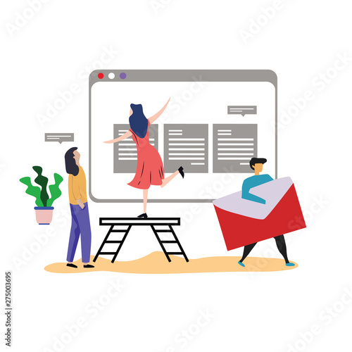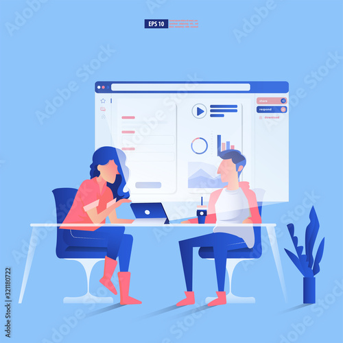 Vector illustration of big mobile phone and tiny people texting messages and posting comments in social networks using digital devices. Social media comments concept for web banner, website page etc.