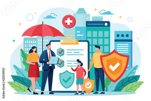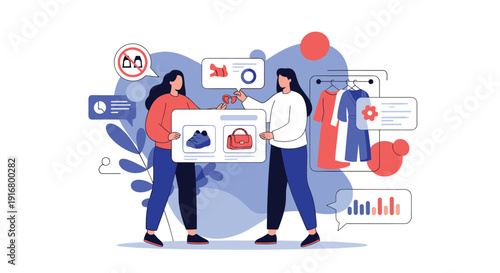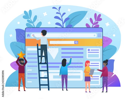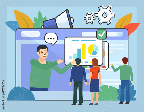 Huge computer monitor and smartphone, tiny characters with social networking like symbols, vector illustration. Social media communication technology, chat, video messages concept for website page etc