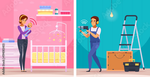 Vector illustration of programmer male in headphones working on computer, testing software. Tester, creative team member flat style design element.
