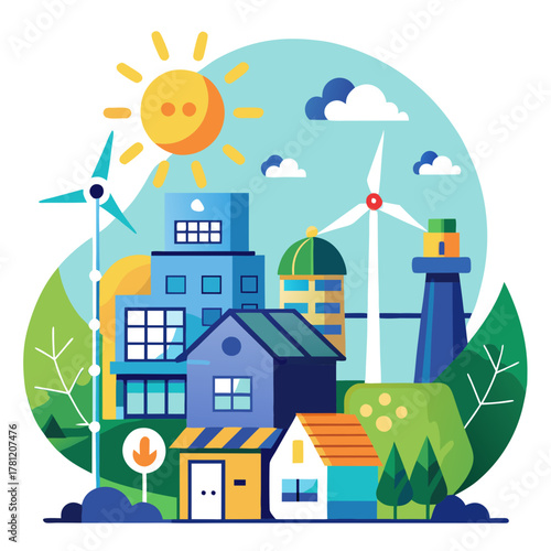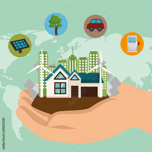 Electricity production, storage and consumption vector flat illustration. Hand holding solar energy battery, residential house with solar panel, plug. Renewable energy and green technology concept.