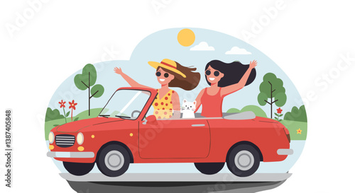 Electric car charging at charger station for electric vehicles in front of solar panels, male and female characters, vector illustration. Eco transport, solar charging station concept.