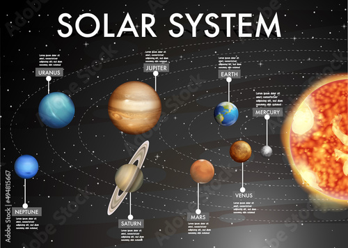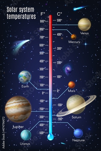 Solar system temperatures diagram. Vector educational poster, scientific infographic, presentation template. Solar system exploration and astronomy science concept.