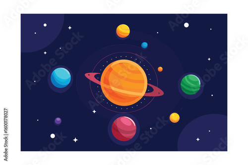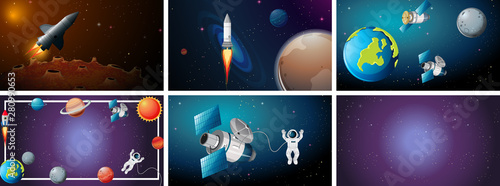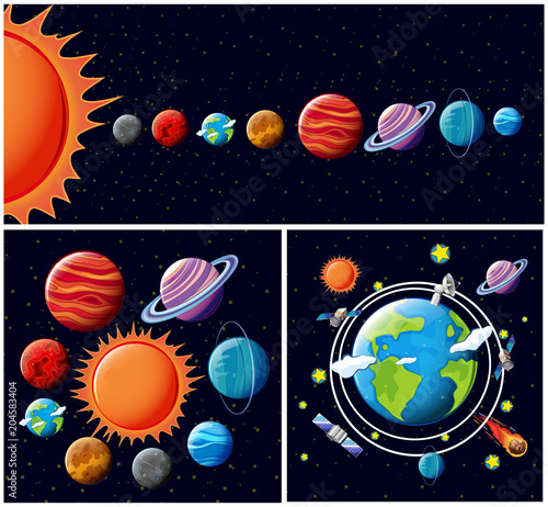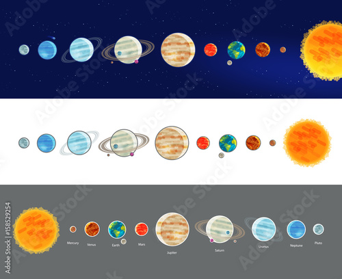 Solar system web banner template set. Vector realistic illustration. Sun, Moon, Earth and other planets of Solar system, stars, comets, constellation. Space exploration innovation astronomy concept.