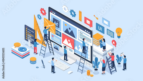 Song writer, video blogger, flat vector isometric illustration. Composer, songwriter creating songs, making music melodies for them. Blogging, vlogging.