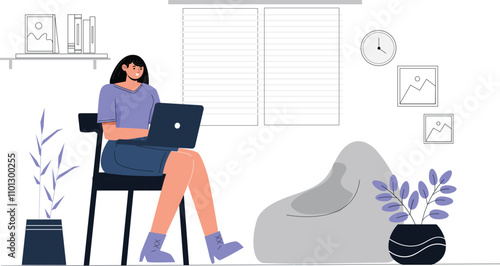 Female sound designer, engineer wearing headphones creating, recording music, flat vector illustration. Sound production studio.
