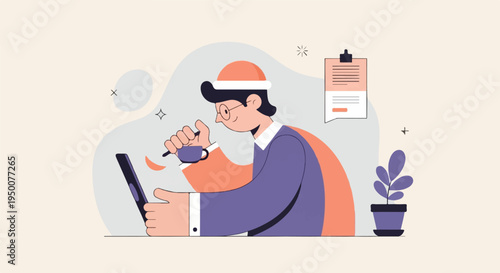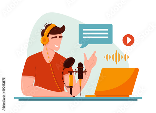 Sound engineer creating podcast on computer vector icon isolated on white background