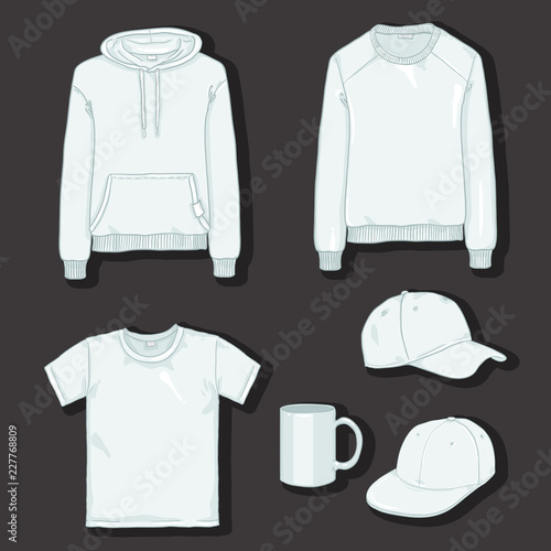 Spa apparel clothing mock up set, vector illustration isolated on white background. Realistic hand drawn terry fluffy towel, slippers, luxurious bathrobe for spa baths.