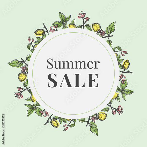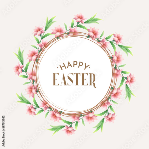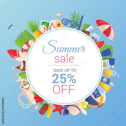 Spa salon round frame, vector illustration. Spa center card, label template with skin care and beauty accessories bamboo stalks, palm leaves, stones, massage oil, cosmetics, towels, aroma candles etc.