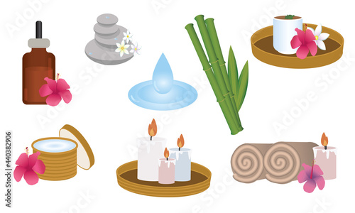 Spa center horizontal banner vector template set. Realistic illustration of bamboo stalks with leaves, aroma candles, soil, massage oil, stones and flowers. Spa beauty salon cards, web banners.