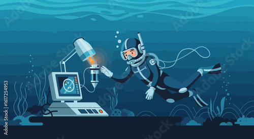 Space exploration concept vector flat illustration. Telescope, satellite, rocket, astronaut helmet, globe and laptop. Astronomy science, space technology poster banner.
