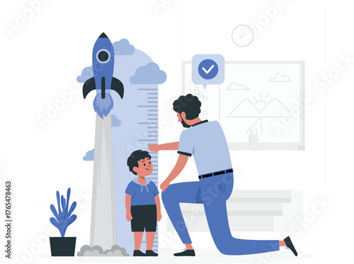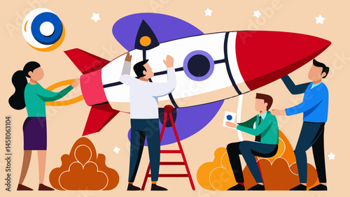 Male and female characters preparing rocket and astronaut for space travel, looking through telescope, vector flat style design illustration. Space exploration, rocket launch, astronomy science.