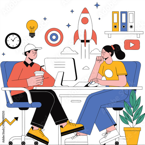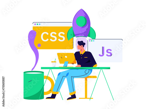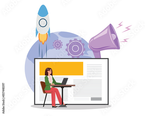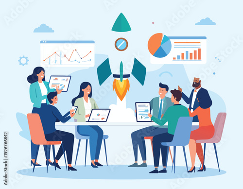 Vector illustration of tiny people engineers constructing big rocket, astronaut. Space exploration technology, aerospace industry concept for web banner, website page etc.