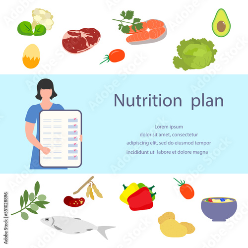 Sport and health vector poster. Date calendar schedule of training, healthy eating diet for weight loss and muscle, fitness stuff and sportswear building illustration