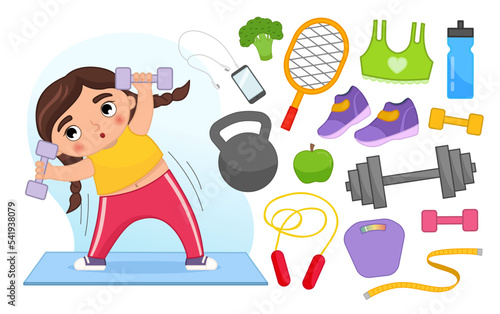Sport equipment big set of happy sportsman and sportswoman, fitness and gaming items vector illustration isolated on white background. Healthy lifestyle tools and people wellness concept