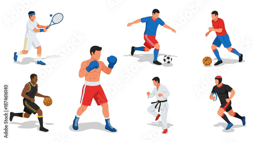 Sport people set, flat vector isolated illustration. Isometric basketball, football, volleyball, hockey, tennis players and athlete runner. Professional athletes doing sport.