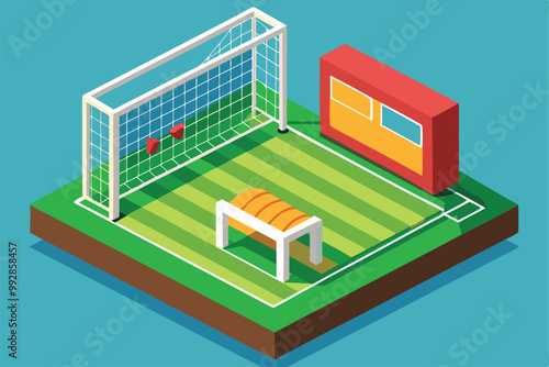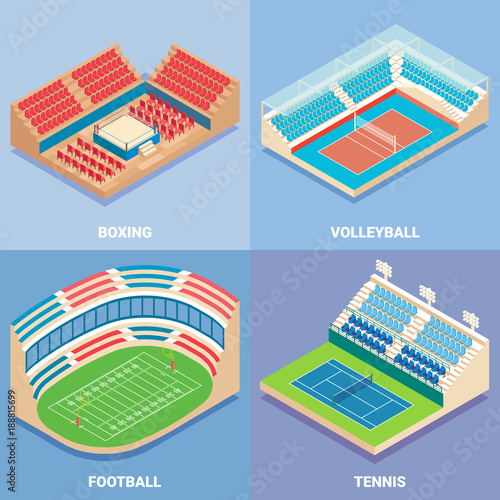 Sport stadium vector isometric icon set. Boxing, Volleyball, Football and Tennis concepts. Outdoor sports venues for championships, training with playing field, court, boxing ring and spectators area.