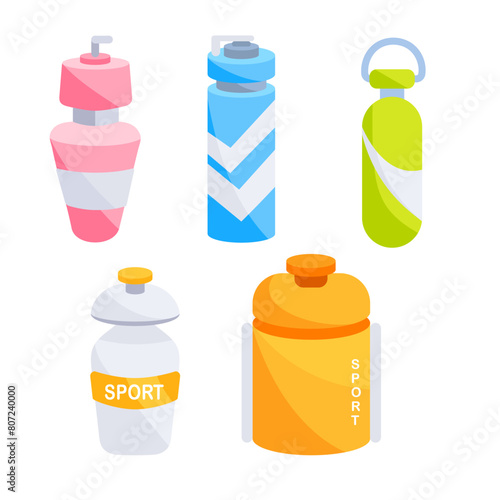 Sport water bottle vector. Reusable flask for fitness isolated set. Container mockup icon. Thermo package, shaker for fitness supplement. Beverage packaging item on white background