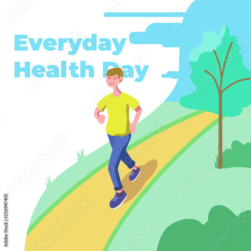 Vector illustration of young man in headphones training in the park. Sportsman flat style design element.