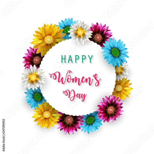 Spring floral round frame, vector illustration in paper art craft style. Beautiful seasonal composition with papercut flowers for card, poster, banner, etc.