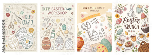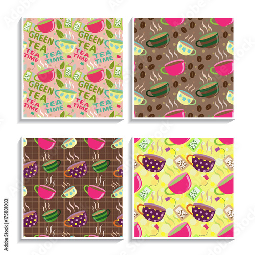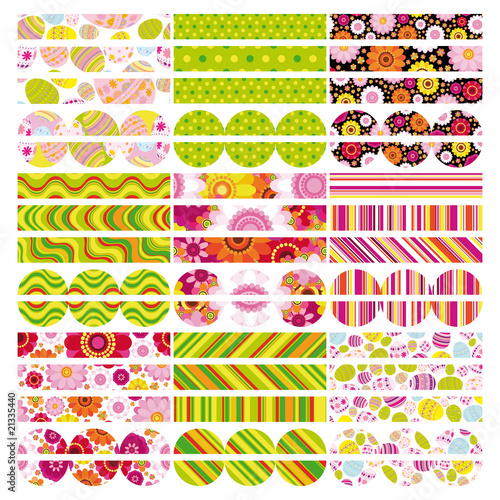Spring flower seamless pattern. Vector set of floral background patterns. Cherry sakura blossom, village farm houses with trees, tulip flowers.