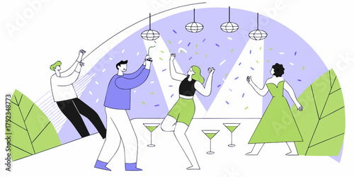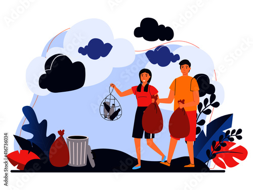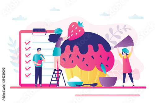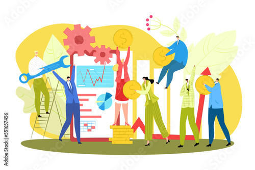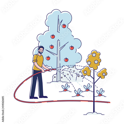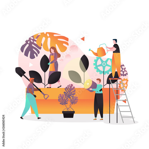 Vector illustration of tiny people gardeners growing big potted plants using garden tools such as watering can, spade etc. Spring gardening, plant care concepts for web banner, website page etc.