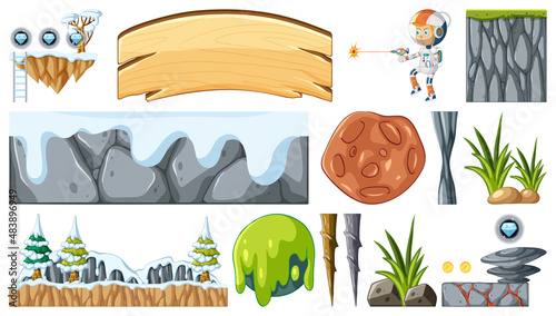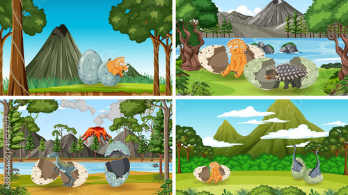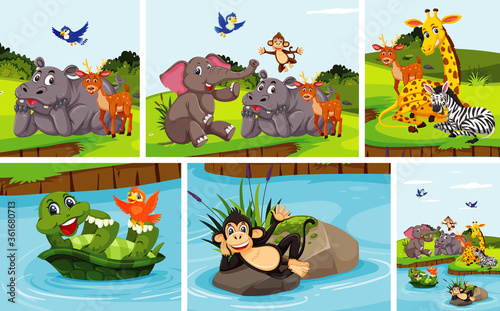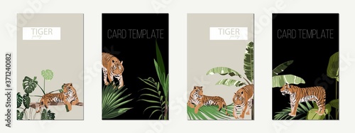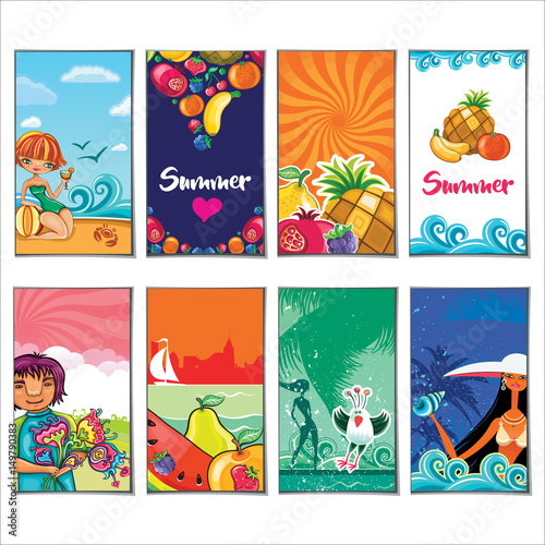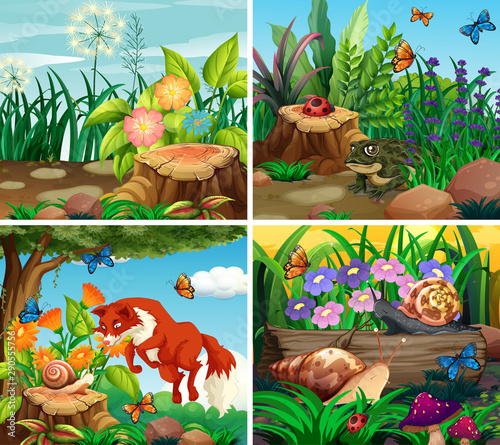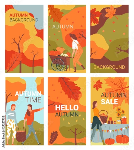 Spring time vector hand drawn posters. Spring season illustrations of happy couple walking in a park, rural landscape with farm and windmill and great tit bird on a cherry blossom branch.