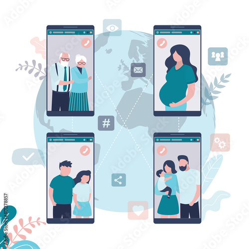 Vector flat style design illustration of big smartphone, computer monitor, tiny people sending and receiving messages. Stay connected using mobile phone computer tablet, stay in touch, messaging app