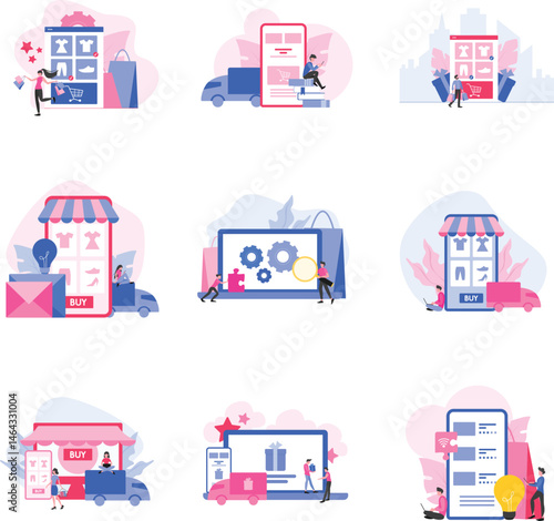 Stay home scene set, flat vector isolated illustration. People working remotely, communicating, dancing using video conference technologies, doing yoga, studying with online teacher in quarantine.