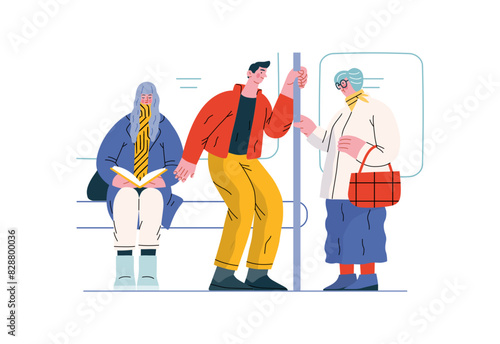 Stewardess and passengers wearing face masks for coronavirus Covid-19 protection on board the aircraft, flat vector illustration. New antiviral flight rules, new normal of air travel, safe flight.