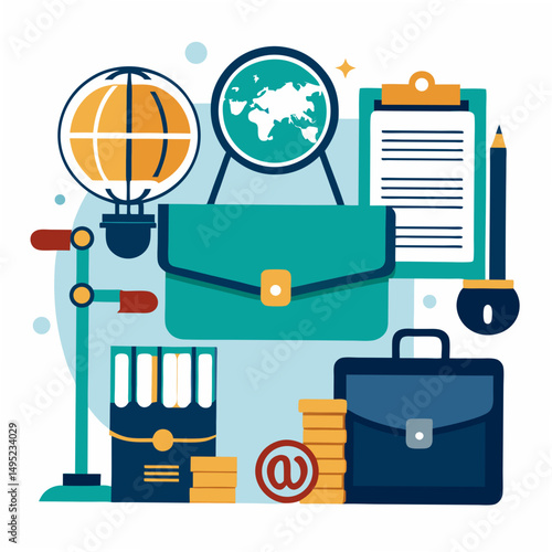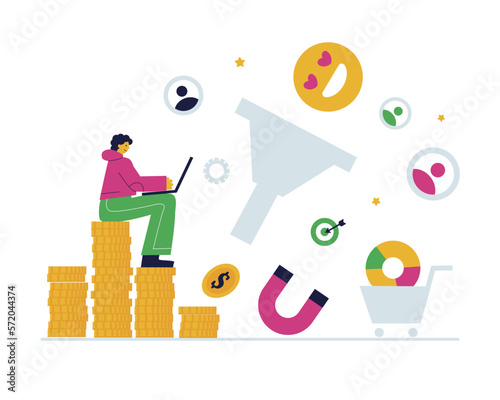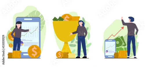 Stock market and trading concept flat vector illustration. Computer screen, board with stock market data and successful business people happy traders, gold coins.