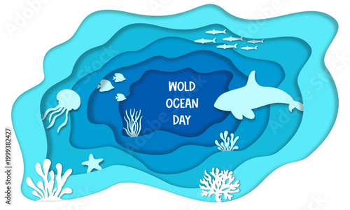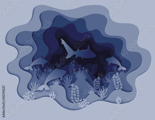 Stop ocean plastic pollution, vector illustration in paper art style. Underwater sea with plastic trash shaped dolphin, marine animals, coral reefs. Ocean environmental problem concept.