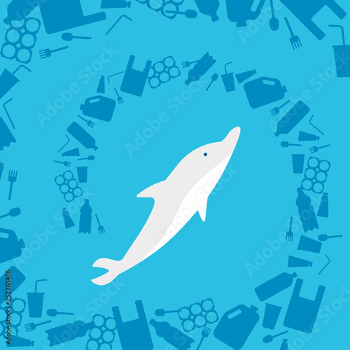 Stop ocean pollution poster design template. Layered paper cut underwater background with floating trash, whale silhouette consisted of plastic waste, vector illustration. Ocean environmental problem.