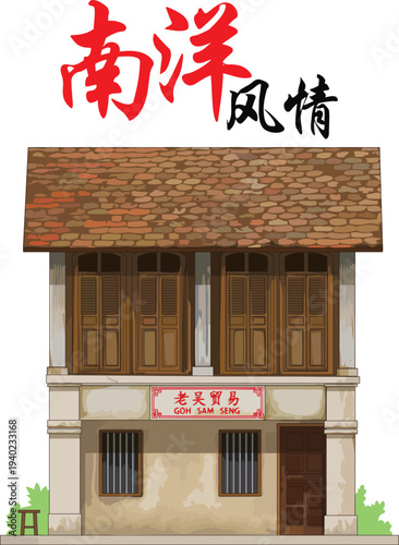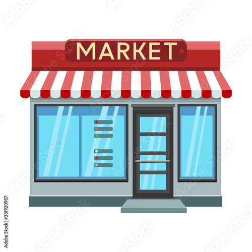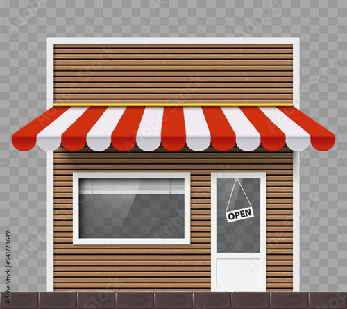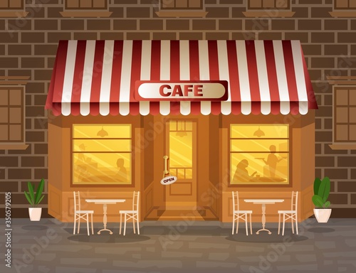Cafe, bakery or shop facade with entrance door and glass windows with striped awnings, vector illustration. Small street shop exterior, brick storefront.